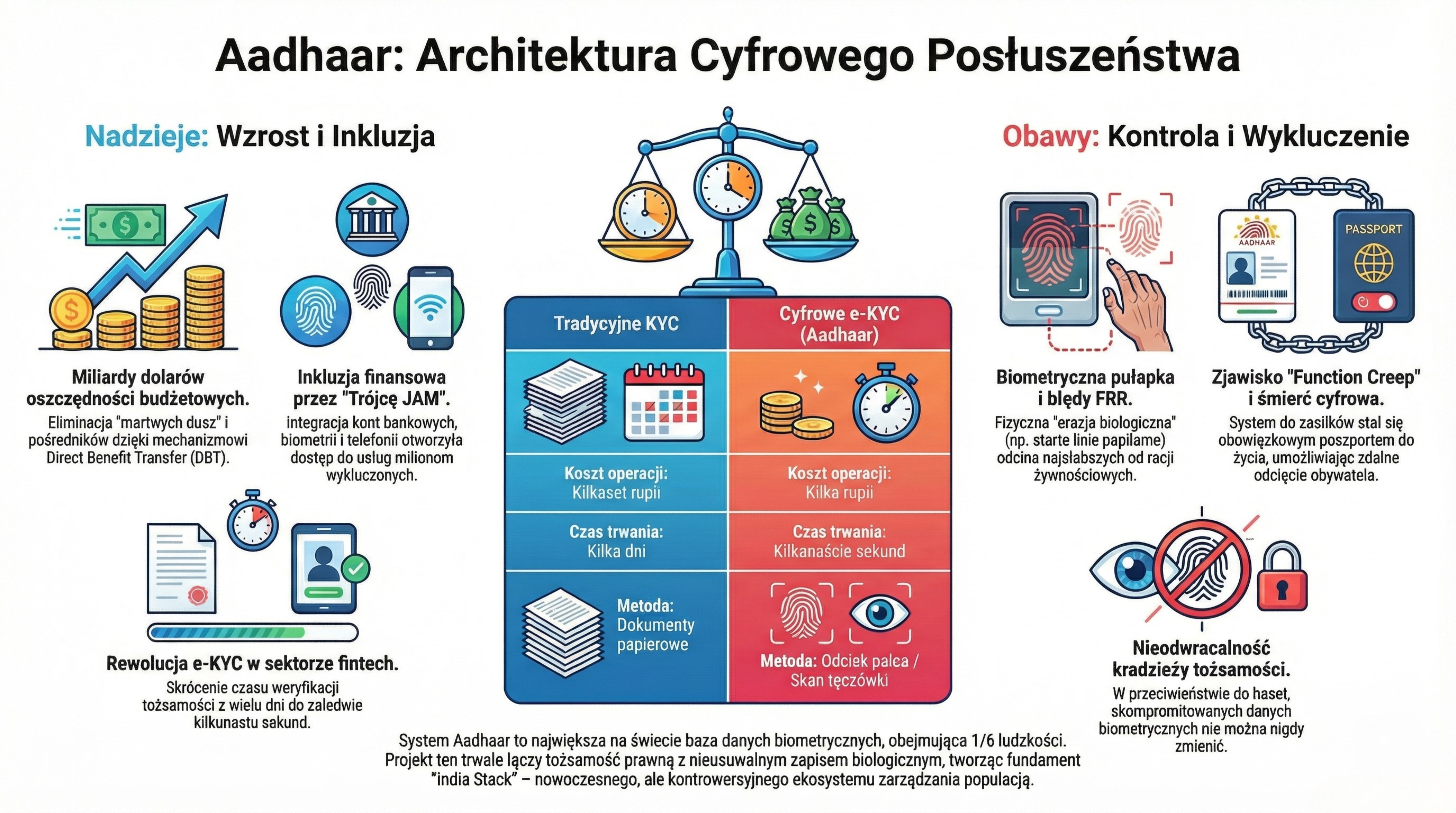 Indyjski Aadhaar to sygnał ostrzegawczy dla całego świata. Dowodzi, że choć cyfryzacja przynosi niepodważalne sukcesy w efektywności państwa i inkluzji finansowej, cena za tę wygodę jest płacona w walucie autonomii jednostki.