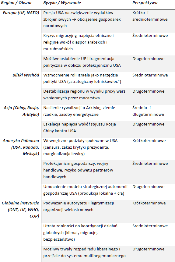 W efekcie kształtuje się świat nowego podziału stref wpływów, rywalizacji surowcowej i osłabienia instytucji multilateralnych – gdzie USA dąży do dominacji nie przez otwartą wojnę, lecz przez sterowanie konfliktami, rynkami i przepływem zasobów.