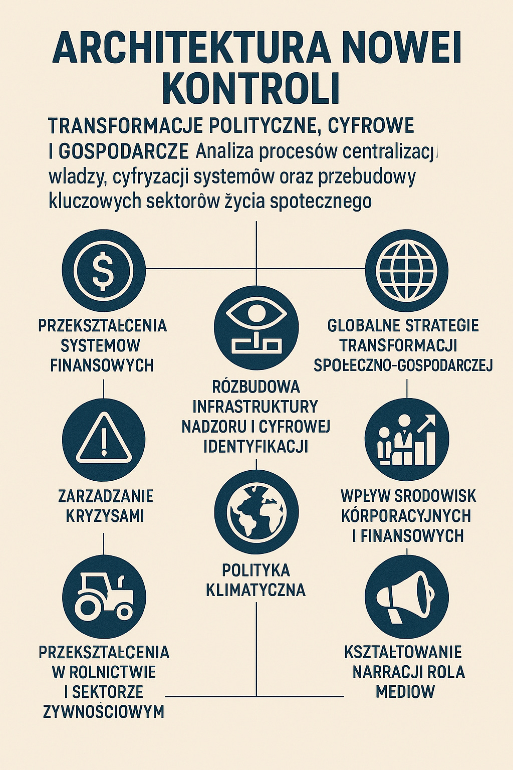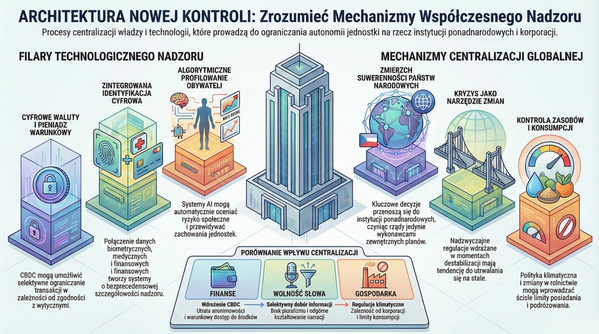 Współczesne procesy polityczne, gospodarcze i technologiczne wskazują na wyraźny trend w kierunku centralizacji władzy oraz rozszerzania narzędzi nadzoru nad społeczeństwem. Transformacje zachodzące w systemach finansowych, cyfrowej identyfikacji, zarządzaniu kryzysowym i polityce klimatycznej tworzą nową architekturę zależności, w której rośnie rola instytucji ponadnarodowych oraz dużych podmiotów korporacyjnych. Integracja danych, rozwój algorytmicznych systemów oceny i monitorowania oraz wdrażanie cyfrowych walut banków centralnych prowadzą do zwiększenia kontroli nad aktywnością jednostek i przedsiębiorstw.