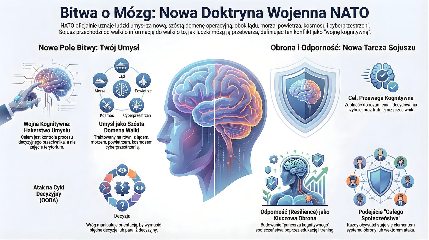 NATO oficjalnie definiuje domenę ludzką jako nowe, krytyczne pole walki, gdzie celem nie jest zajęcie terytorium, lecz przejęcie kontroli nad procesem decyzyjnym przeciwnika. Raport Głównego Naukowca NATO (STO) ujawnia, że Sojusz przechodzi od tradycyjnej obrony fizycznej do walki o “Przewagę Kognitywną”, angażując neurobiologię i technologie cyfrowe do obrony przed masową manipulacją.