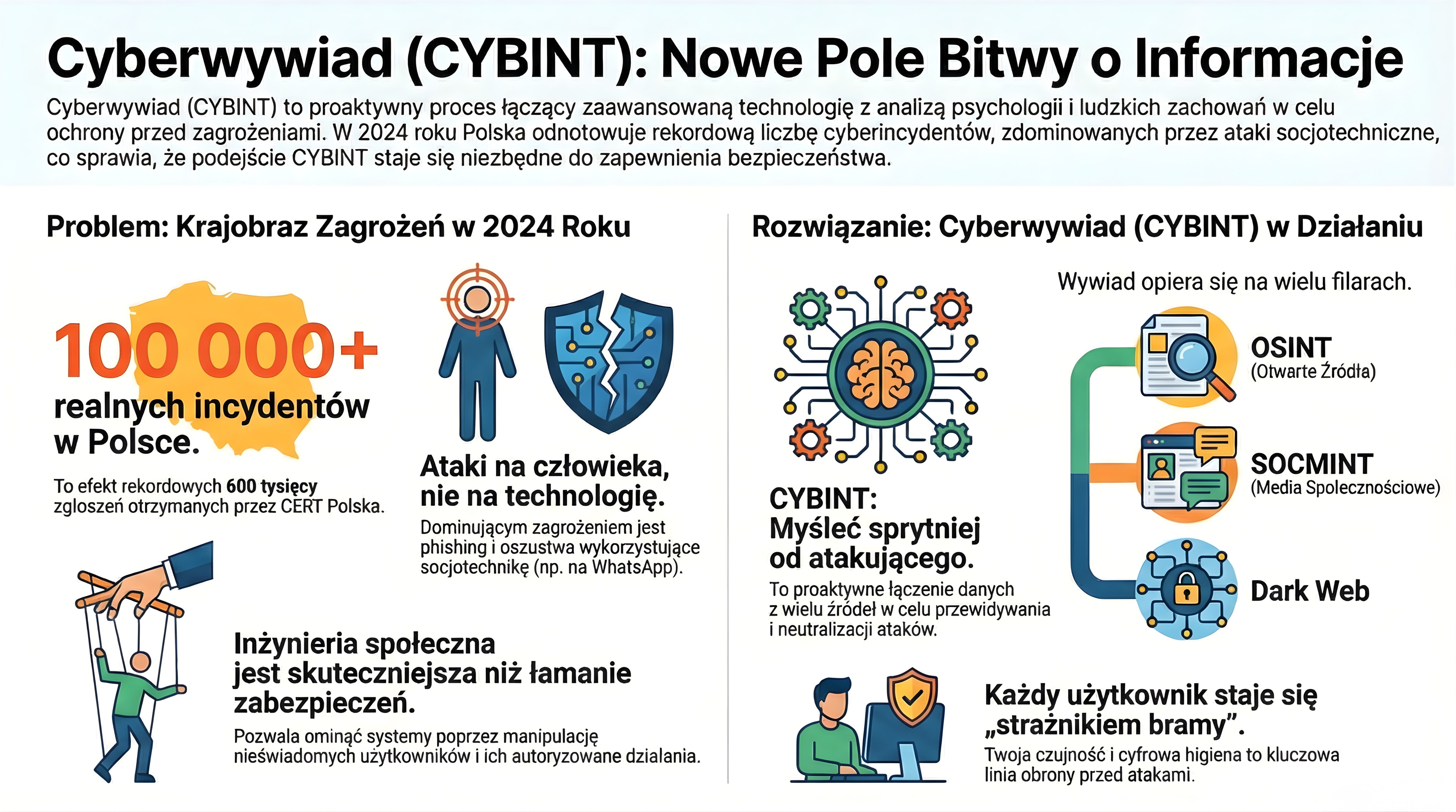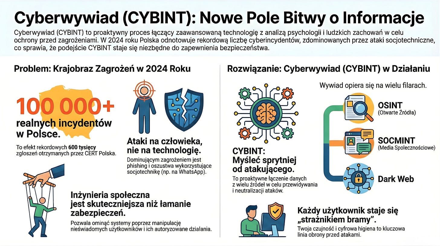 CYBINT (Cyber Intelligence = Cyber-Wywiad) to proces gromadzenia i analizy informacji z cyberprzestrzeni służący ochronie przed zagrożeniami oraz wspieraniu decyzji strategicznych. Łączy on zaawansowane technologie techniczne z metodami wywiadu osobowego, tworząc fundament nowoczesnego bezpieczeństwa państw i organizacji. Analiza wskazuje na gwałtowną profesjonalizację cyberprzestępczości oraz wzrost znaczenia inżynierii społecznej wspieranej przez sztuczną inteligencję w Polsce i UE.