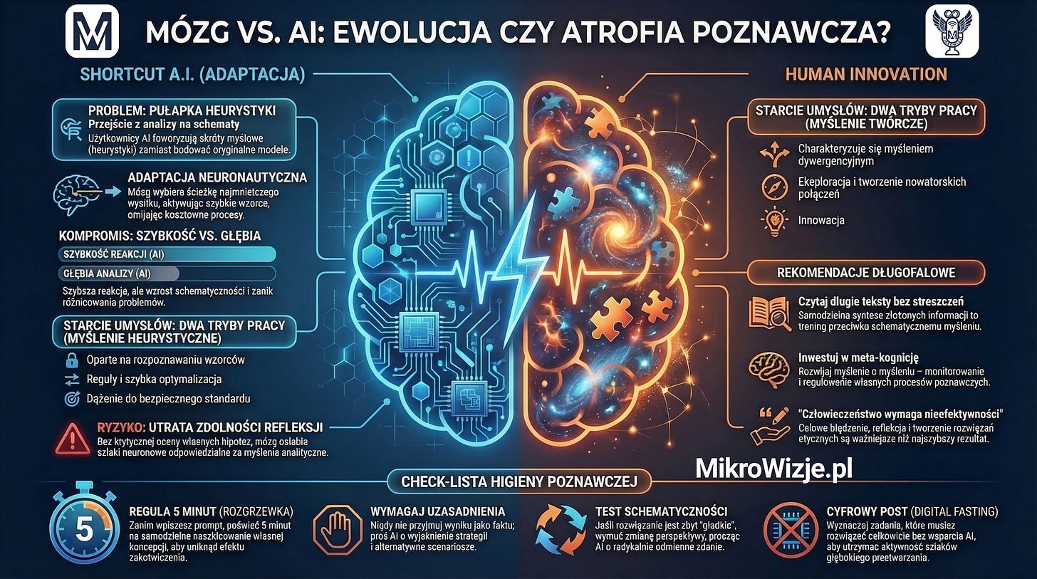 W świecie pełnym gotowych schematów, Twoją największą przewagą staje się umiejętność myślenia o tym, jak myślisz. Prawdziwa innowacja wymaga dziś... świadomej nieefektywności. To pozwolenie sobie na błądzenie, na empatię i na zadawanie pytań, których algorytm nigdy by nie zadał. Zamiast ścigać się z AI na szybkość, musimy skupić się na tym, w czym maszyna kuleje: na łączeniu odległych faktów i szukaniu tego, co nieoczywiste.