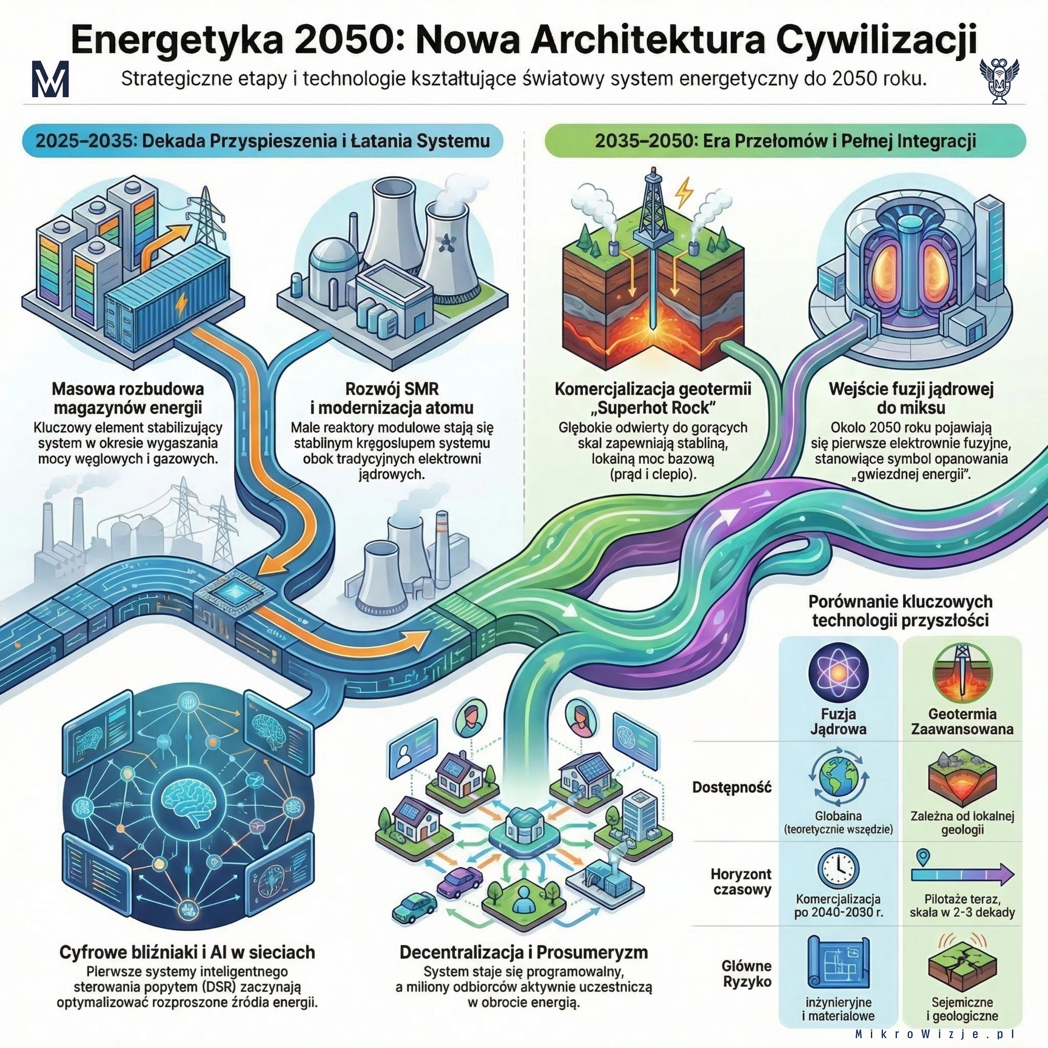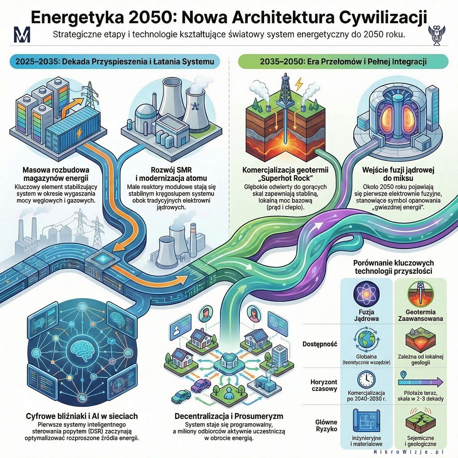 Geotermia (w tym superhot rock) może wejść do gry wcześniej, jako lokalne, stabilne źródło. Fuzja – później, jako potencjalny globalny „game changer”.
