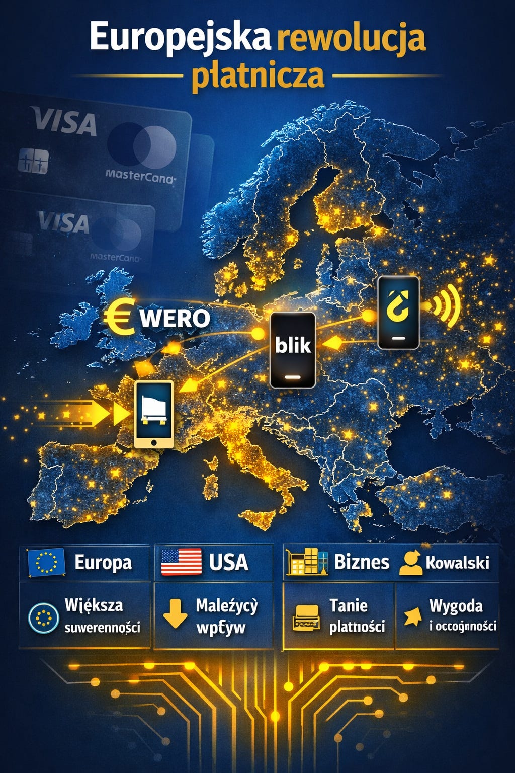 Europejski system płatniczy WERO oraz rosnąca rola BLIKA stopniowo ograniczają amerykańską dominację finansową, ponieważ przesuwają ciężar infrastruktury rozliczeniowej z sieci kontrolowanych przez Visa i Mastercard na europejskie rozwiązania oparte na przelewach natychmiastowych i integracji bank–bank.