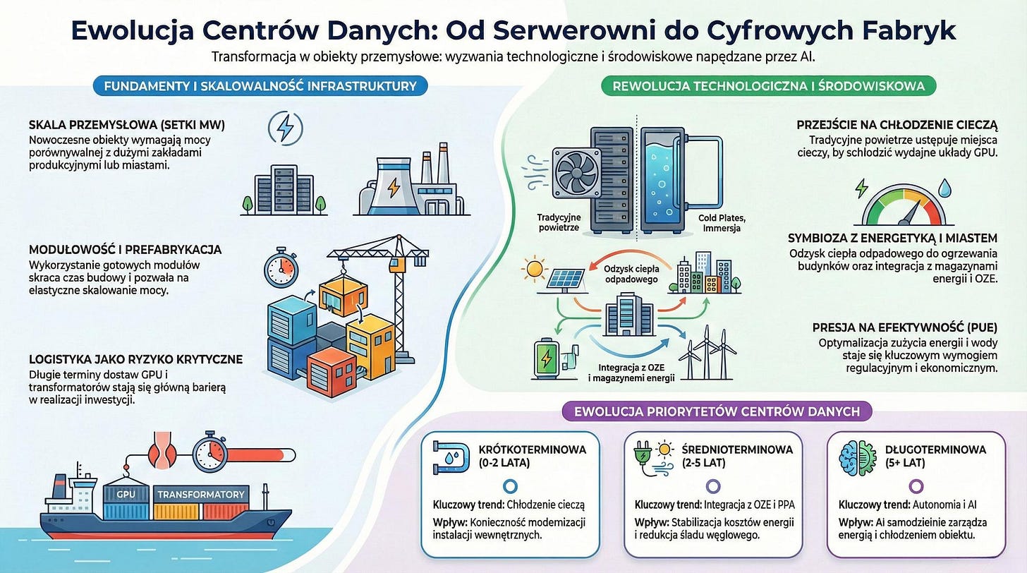 Współczesne centra danych stają się złożonymi obiektami przemysłowymi, których budowa wymaga integracji zaawansowanych systemów energetycznych, chłodniczych i sieciowych. Rosnące zapotrzebowanie na moc obliczeniową, szczególnie w obszarze sztucznej inteligencji, wymusza stosowanie nowych technologii chłodzenia oraz budowę dedykowanej infrastruktury energetycznej. Modułowość i prefabrykacja przyspieszają realizację inwestycji, jednocześnie umożliwiając elastyczne skalowanie zasobów. Kluczowym wyzwaniem pozostają globalne łańcuchy dostaw, które wpływają na harmonogramy i koszty projektów. Ekonomika centrów danych coraz silniej zależy od efektywności energetycznej oraz dostępu do stabilnych i tanich źródeł energii. Jednocześnie rośnie znaczenie aspektów środowiskowych, takich jak zużycie wody, emisje CO₂ i odzysk ciepła. Cały sektor staje się strategicznym elementem infrastruktury cyfrowej, wpływając zarówno na gospodarkę, jak i na lokalne społeczności.