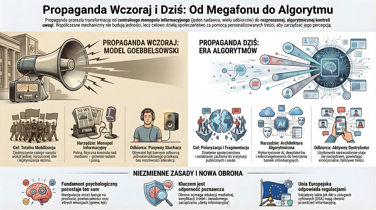 Analiza zestawia historyczne metody propagandy totalitarnej z nowoczesnymi, zdecentralizowanymi mechanizmami cyfrowymi, wskazując na trwałość psychologicznych fundamentów manipulacji przy radykalnej zmianie technologii. Współczesne systemy wykorzystują algorytmy i sztuczną inteligencję do zarządzania percepcją społeczną poprzez polaryzację i mikrotargetowanie.