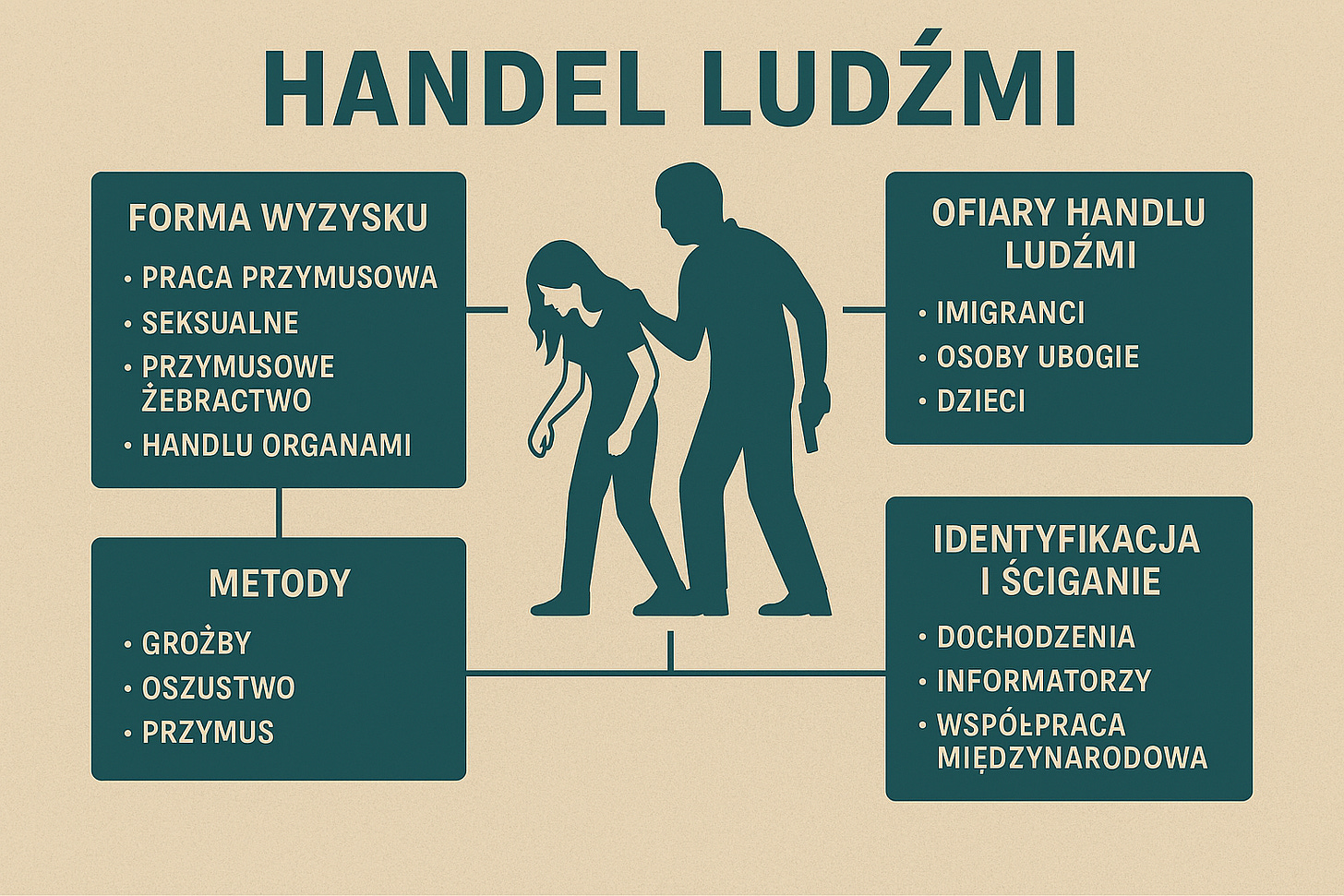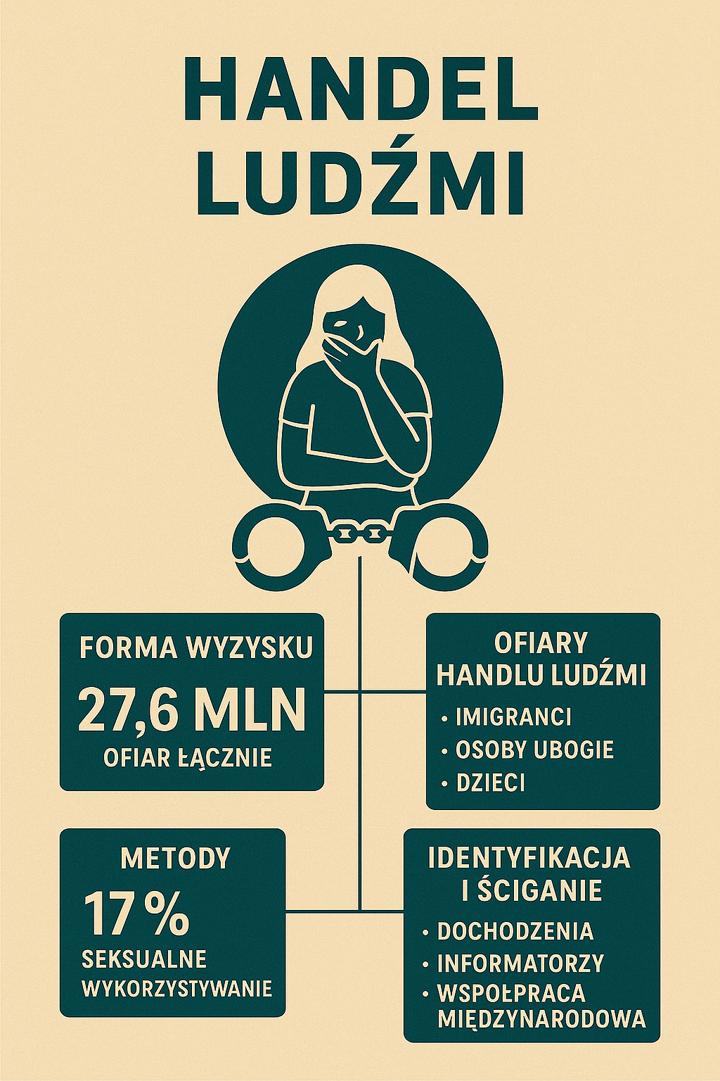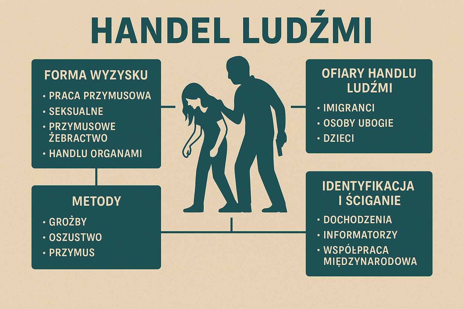 Handel ludźmi to globalny, ukryty system przemocy i eksploatacji, w którym ofiary (najczęściej osoby w trudnej sytuacji życiowej) są podporządkowywane poprzez manipulację, kontrolę i przymus. Zjawisko to napędzają nierówności społeczne, popyt na tanią pracę oraz wysokie zyski osiągane przez sprawców działających indywidualnie lub w ramach zorganizowanych sieci. Skuteczna walka z tym procederem wymaga współpracy państw, odpowiedzialności biznesu i świadomego społeczeństwa.