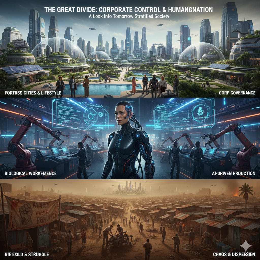 Przedstawiony materiał to hipotetyczna, alarmistyczna wizja przyszłości, bliższa konwencji science fiction niż twardej analizie prognostycznej opartej na danych. Jest to celowo skrajny scenariusz ostrzegawczy , który ma za zadanie sprowokować do dyskusji na temat potencjalnych, negatywnych konsekwencji ekstrapolacji obecnych trendów ekonomicznych, technologicznych i społecznych. Nie należy traktować go jako nieuchronnej prognozy, lecz jako jeden z możliwych, deterministycznych torów rozwoju.