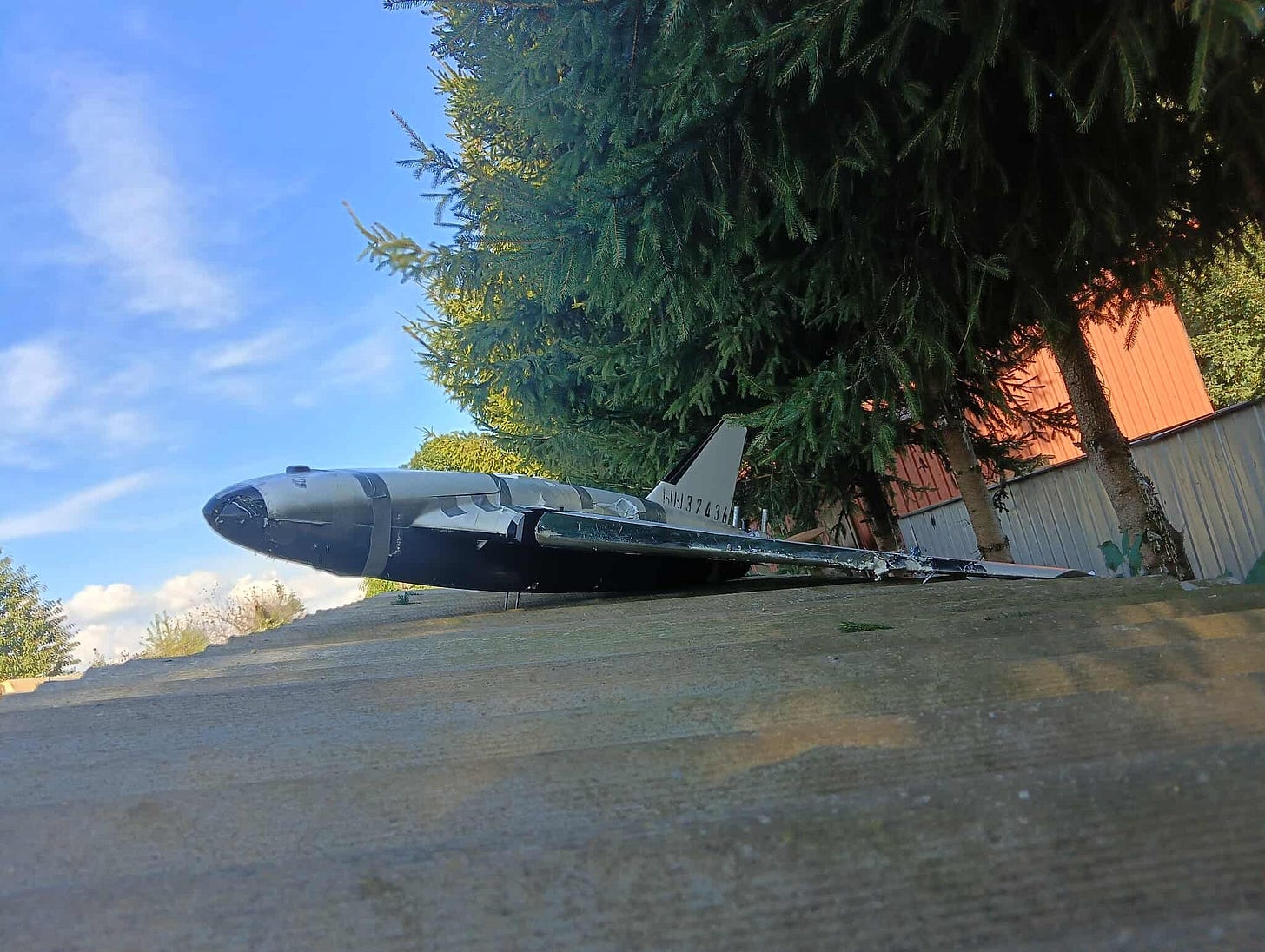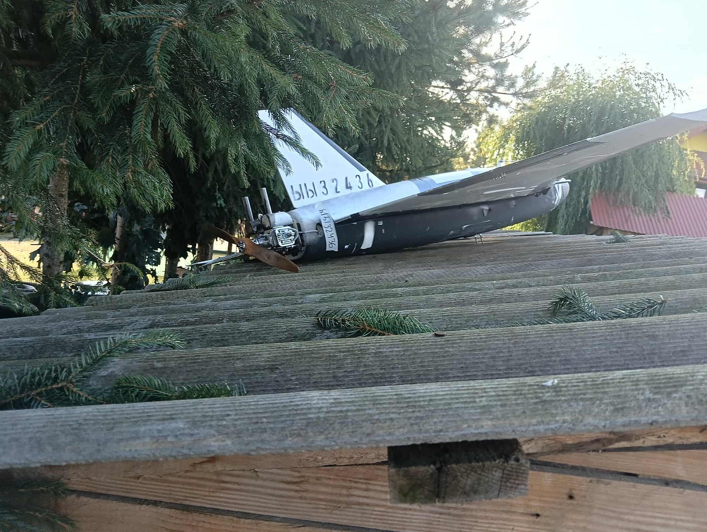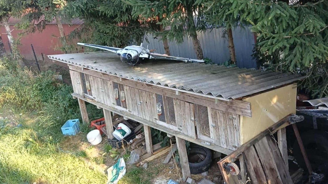 Dron lądujący na klatce dla królików bez widocznych uszkodzeń — podejrzenie inscenizacji. Dron leży dziobem ku przodowi klatki, silnik ma z tylu (śmigło), a za nim są jakieś iglaki, których parę gałązek leży też na klatce. Wygląda to tak jak by dron (Parkował na wstecznym), lub jak by go ktoś tam położył.