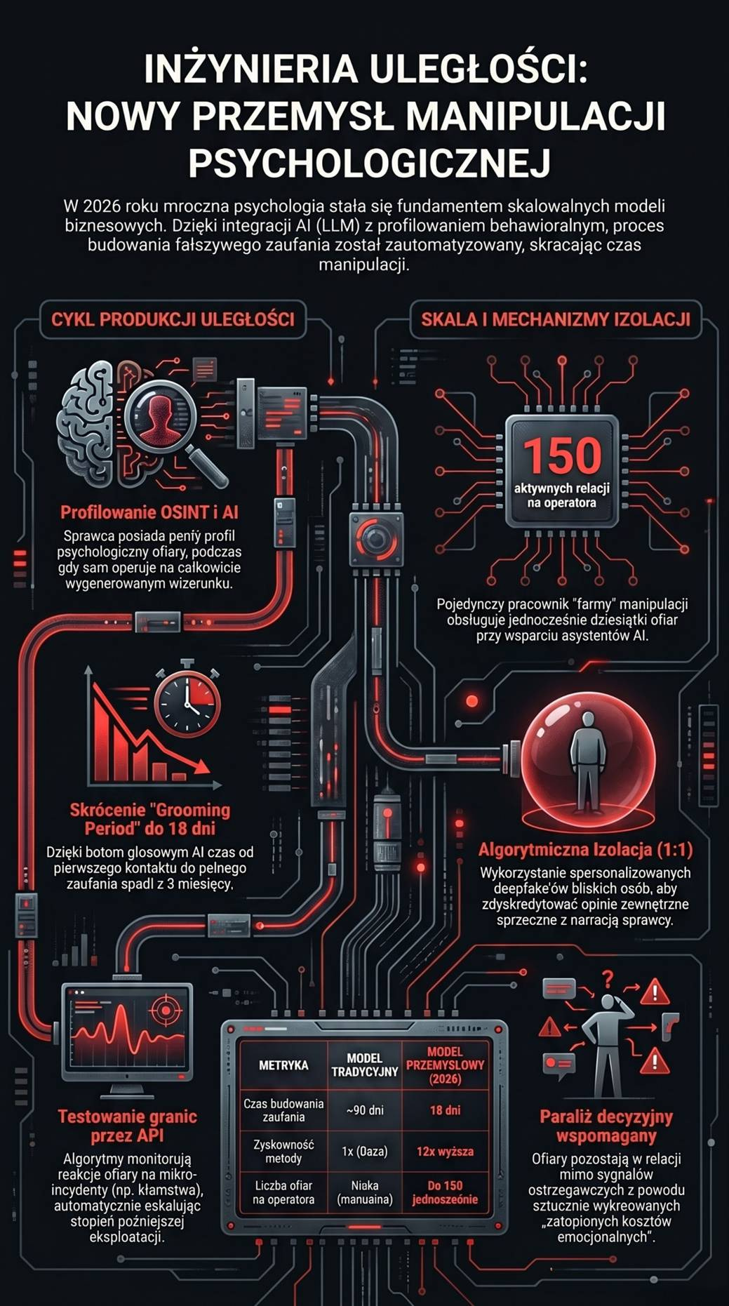 Współczesna manipulacja psychologiczna wykorzystuje zaawansowaną technologię do przemysłowego niszczenia barier obronnych jednostki poprzez systematyczne budowanie fałszywego poczucia bliskości i izolowanie jej od wiarygodnych źródeł informacji. Przemysłowy model manipulacji to przejście od toksycznych jednostek do systemowo zoptymalizowanych procesów ogołacania ofiar z zasobów poprzez technologiczną emulację bliskości i autorytetu.