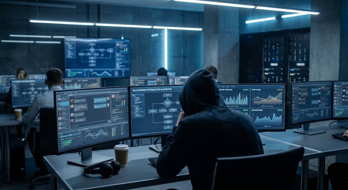 Wiele raportów branżowych (m.in. od Chainalysis i NINJIO), opisuje te same zjawiska: pojedynczy operator “farmy” obsługuje jednocześnie do 150 aktywnych “relacji” (biznesowych lub romantycznych), korzystając z asystentów AI, którzy analizują luki w poczuciu wartości ofiary w czasie rzeczywistym.