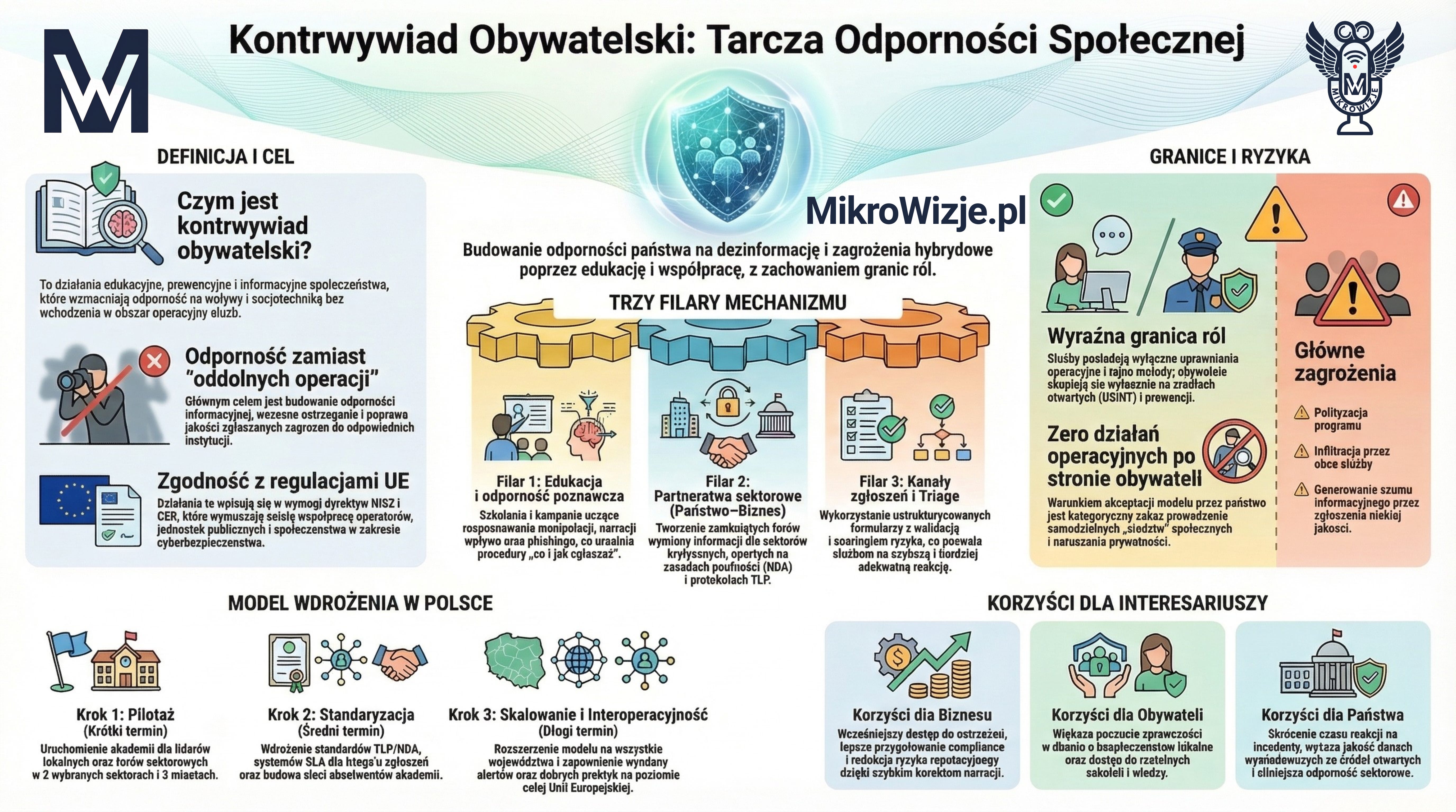 Fundamentem tego rozwiązania jest symbioza między instytucjonalnym nadzorem a obywatelską czujnością. Kontrwywiad obywatelski to nie „oddolne operacje”, lecz systemowa ochrona odporności poznawczej społeczeństwa. To przejście od reaktywnego gaszenia pożarów informacyjnych do proaktywnej prewencji, opartej na zaufaniu i profesjonalnej wymianie sygnałów.