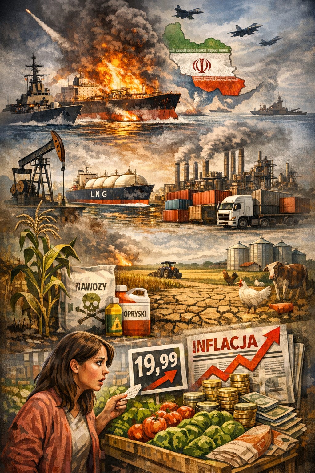 Konflikt wokół Iranu i ryzyko blokady cieśniny Ormuz uruchamia globalny szok energetyczny, który natychmiast podnosi ceny ropy, gazu i transportu. Wysokie koszty energii i logistyki przenoszą się na przemysł chemiczny, ograniczając produkcję nawozów i środków ochrony roślin. Rolnictwo, pozbawione kluczowych nakładów, doświadcza spadku plonów i większej podatności na choroby oraz czynniki pogodowe. W efekcie rosną ceny żywności, a globalny system żywnościowy staje się bardziej niestabilny. Całość procesu napędza trwałą presję inflacyjną i zwiększa ryzyko gospodarcze, społeczne oraz polityczne w wielu krajach.