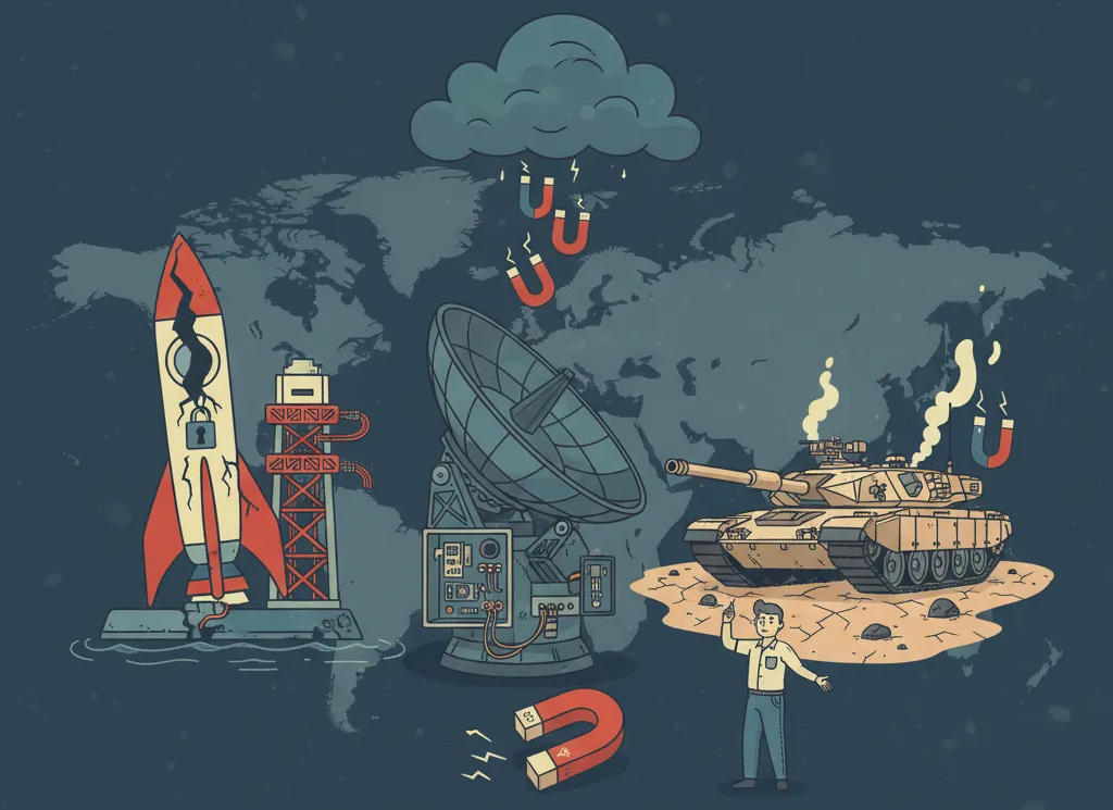 Metale ziem rzadkich (neodym, dysproz, terb) są krytyczne dla nowoczesnej technologii wojskowej: w magnesach trwałych silników elektrycznych, systemach kierowania pociskami (np. Tomahawk), radarach i laserach. Każdy zaawansowany myśliwiec (np. F-35) czy okręt podwodny wymaga tych pierwiastków.