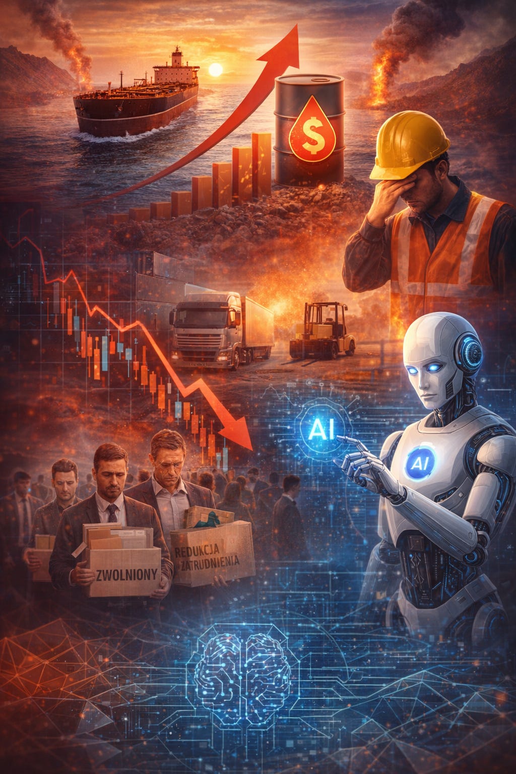 Długotrwałe zakłócenia w cieśninie Ormuz powodują globalny kryzys energetyczny. Ceny paliw i energii rosną gwałtownie, łańcuchy dostaw ulegają destabilizacji, a wiele firm ogranicza działalność lub przenosi produkcję. Redukcje zatrudnienia są masowe, szczególnie w sektorach fizycznych i transportowych. Automatyzacja staje się koniecznością, a nie wyborem, co prowadzi do trwałej eliminacji wielu zawodów. Rynek pracy potrzebuje 4–6 lat, aby osiągnąć nową równowagę.