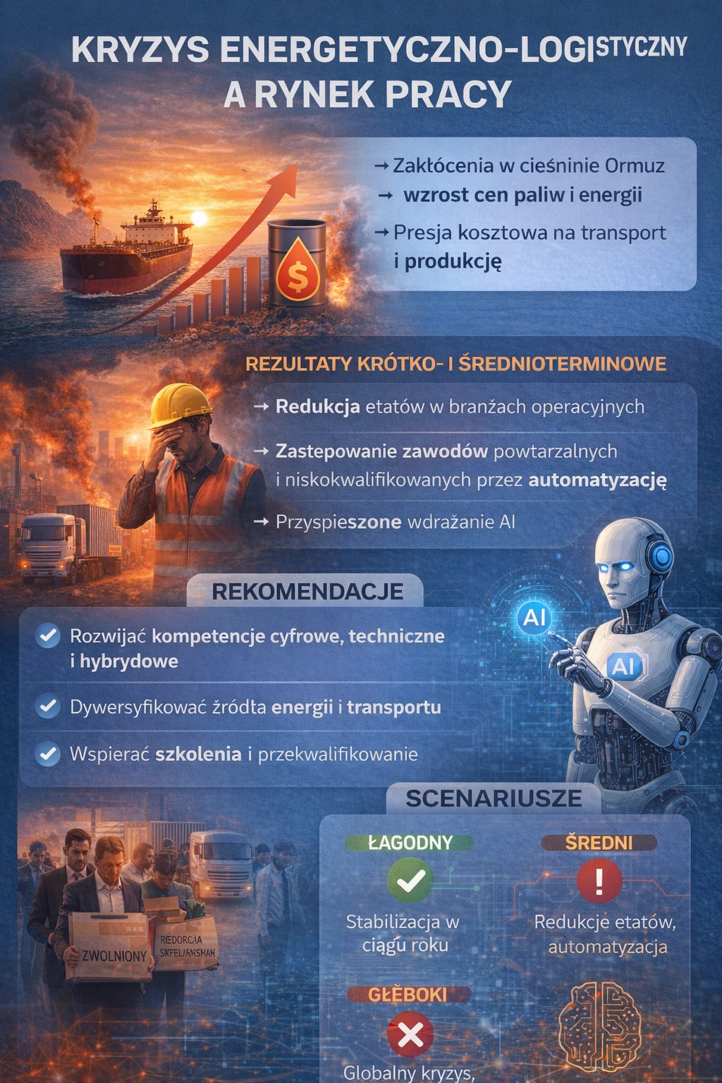 Kryzys wywołany zakłóceniami w cieśninie Ormuz prowadzi do gwałtownego wzrostu cen paliw i energii, co najsilniej uderza w gospodarki uzależnione od importu surowców kopalnych, w tym Polskę. Firmy reagują na presję kosztową nie tylko redukcją etatów, ale strategicznym przyspieszeniem automatyzacji, co czyni obecną transformację nieodwracalną. Rynek pracy przechodzi trwałą zmianę strukturalną: zawody powtarzalne są eliminowane na rzecz modeli hybrydowych i kompetencji cyfrowych. Kluczem do stabilizacji jest szybka transformacja energetyczna, dywersyfikacja dostaw oraz aktywna rola państwa w procesie przekwalifikowania pracowników, co pozwoli ograniczyć ryzyko pogłębienia się nierówności społecznych.
