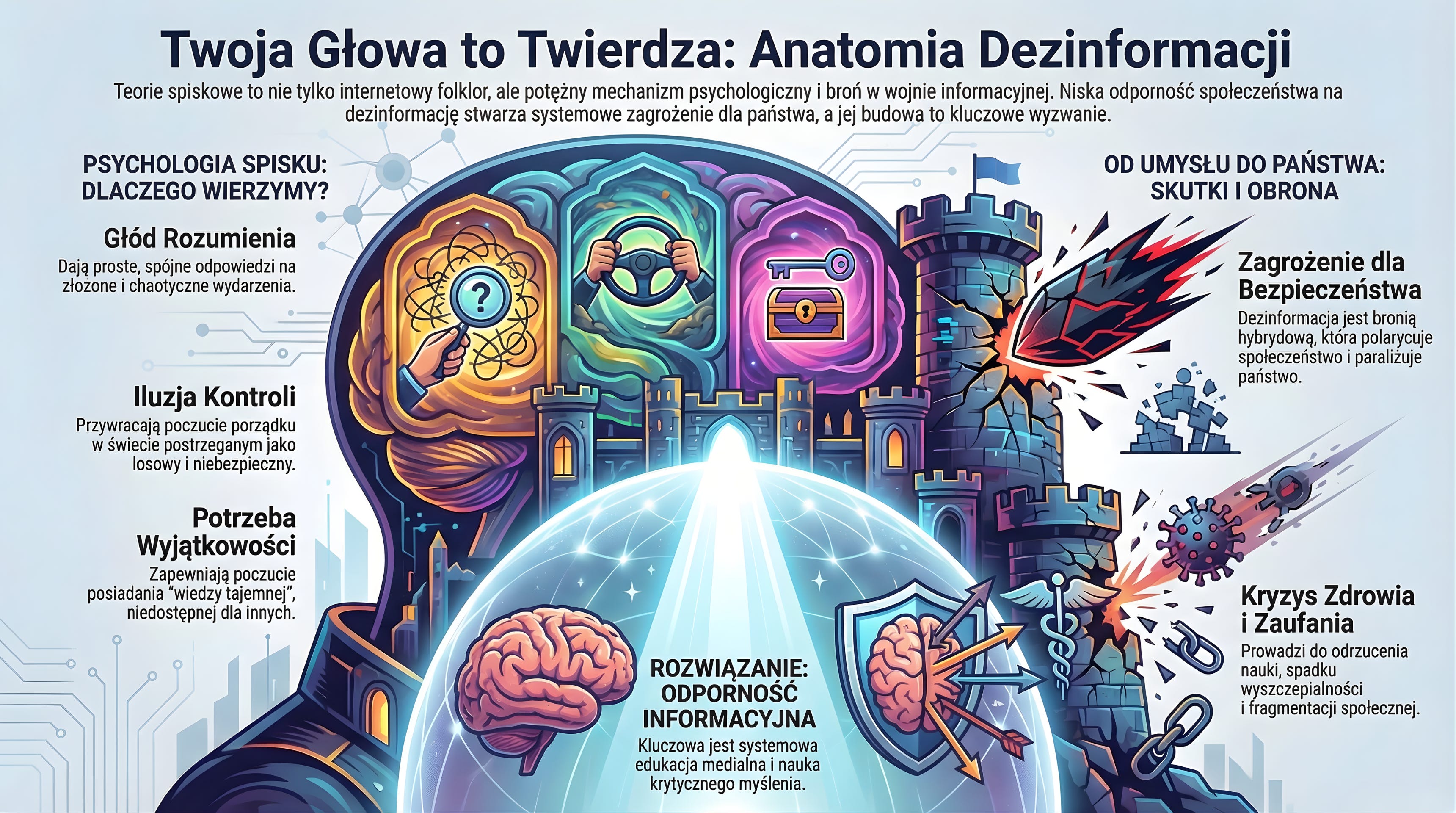 Dlaczego w dobie nieograniczonego dostępu do wiedzy wybieramy wiarę w ukryte spiski, jak budować społeczną odporność i jak odróżnić paranoję od uzasadnionego sceptycyzmu? Teorie spiskowe nie są jedynie marginesem folkloru internetowego, lecz skomplikowanym mechanizmem psychologicznym zaspokajającym potrzeby bezpieczeństwa, a jednocześnie potężnym narzędziem walki geopolitycznej. Kluczowym czynnikiem ryzyka jest niska odporność informacyjna społeczeństwa, która sprawia, że dezinformacja staje się systemowym zagrożeniem dla bezpieczeństwa państwa.