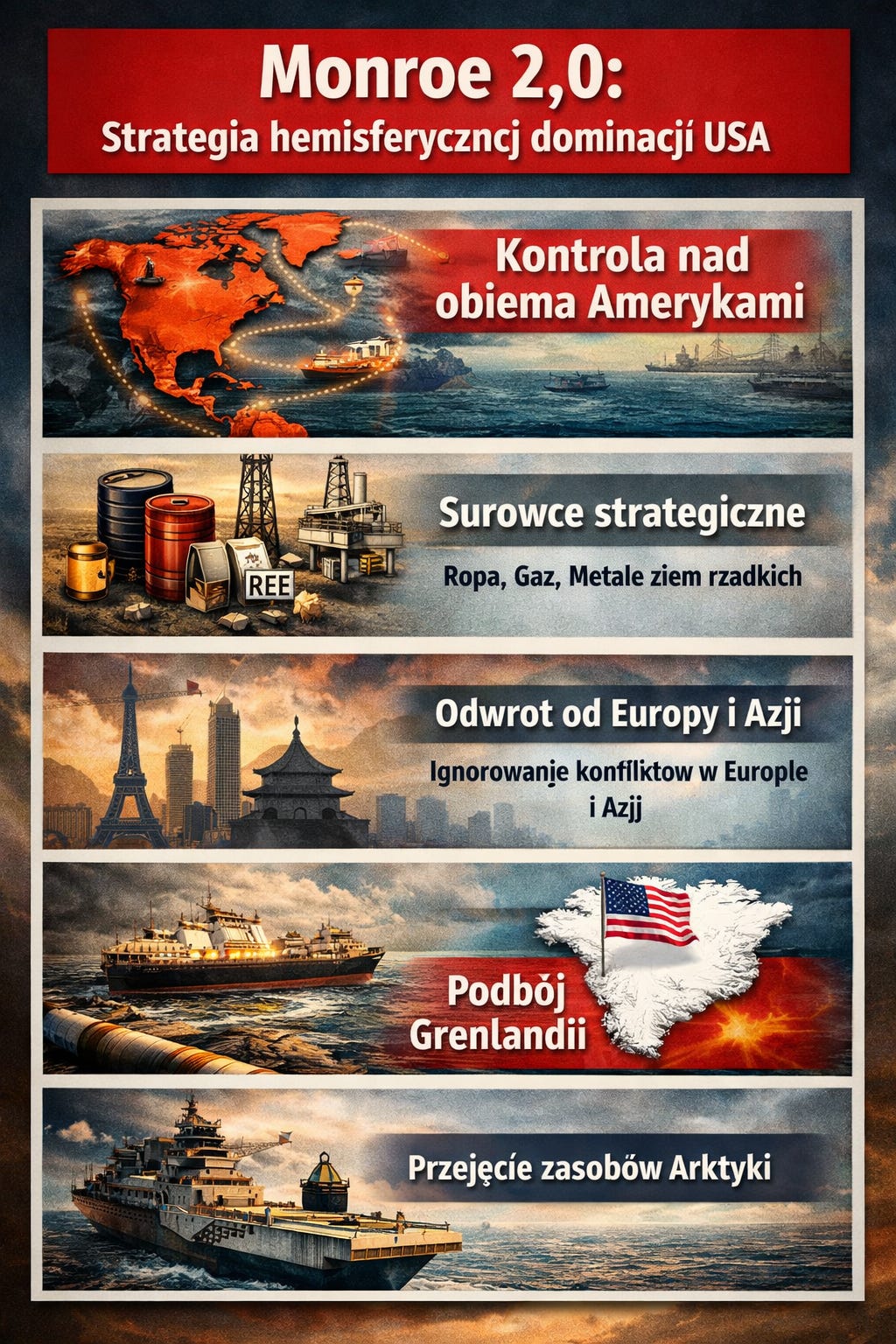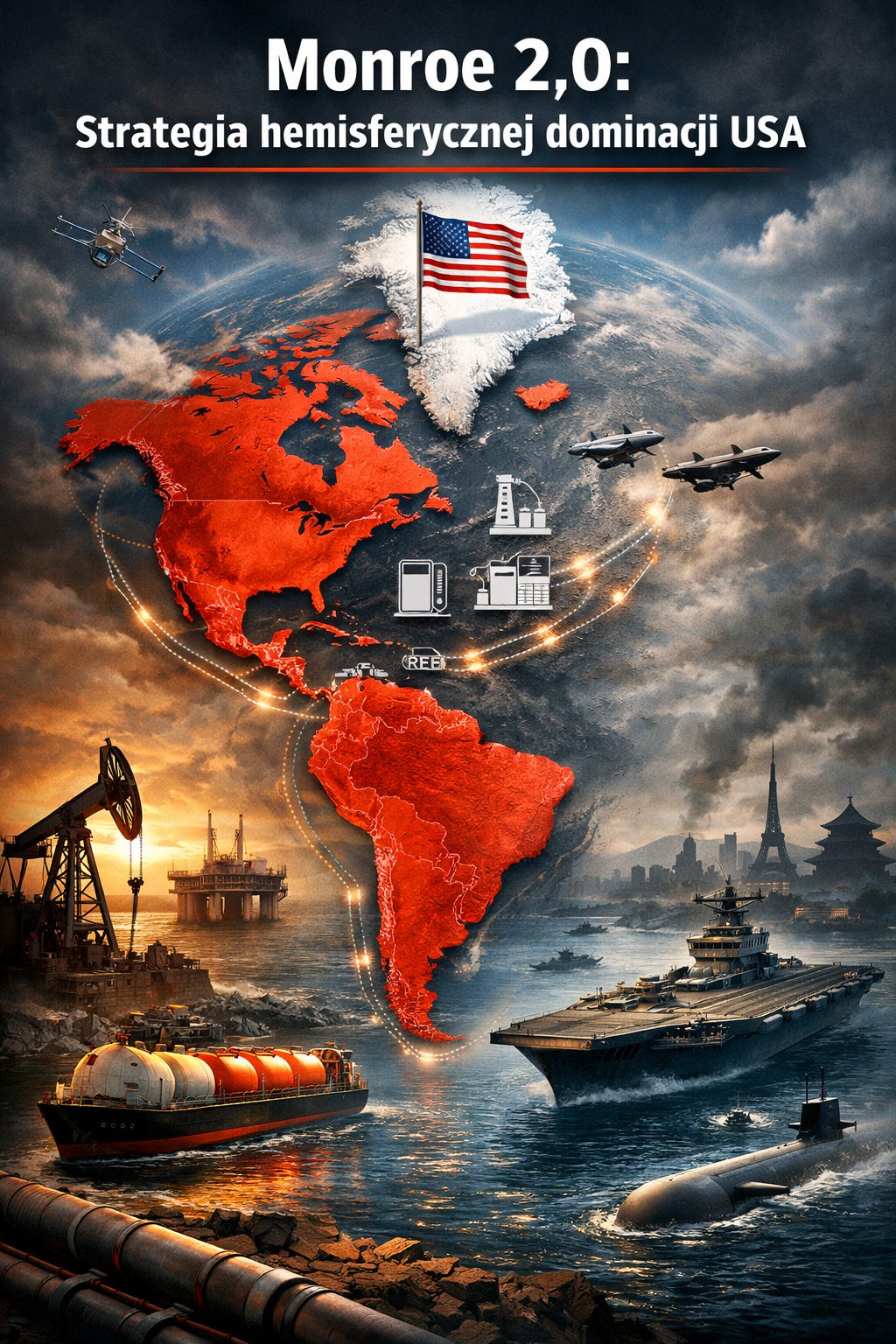 USA przechodzą do realizacji strategii hemisferycznej, której celem jest pełna kontrola nad obiema Amerykami oraz budowa samowystarczalnego bloku produkcyjno‑surowcowego. W praktyce oznacza to wypieranie Chin z Ameryki Łacińskiej, zabezpieczanie dostępu do ropy, gazu i metali ziem rzadkich oraz wzmacnianie kontroli nad kluczowymi szlakami handlowymi. Europa i Azja stają się obszarami drugorzędnymi, co prowadzi do ich rosnącej niestabilności i konieczności samodzielnego kształtowania bezpieczeństwa. Równolegle rośnie znaczenie Arktyki i Grenlandii jako przyszłych źródeł zasobów krytycznych. Całość wskazuje na trwałe przesunięcie centrum globalnej potęgi w kierunku panamerykańskiego układu gospodarczego i geopolitycznego.