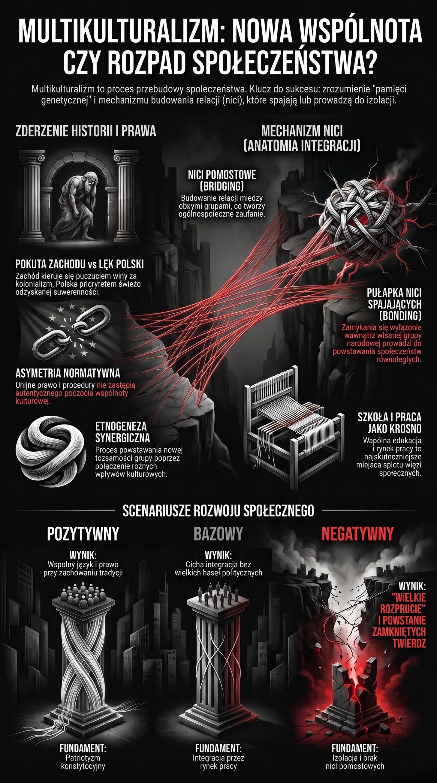 Przyszłość zależy od tego, czy nauczymy się budować relacje między grupami (nici pomostowe), zanim lęk i historia całkiem rozepną tkaninę naszego społeczeństwa.