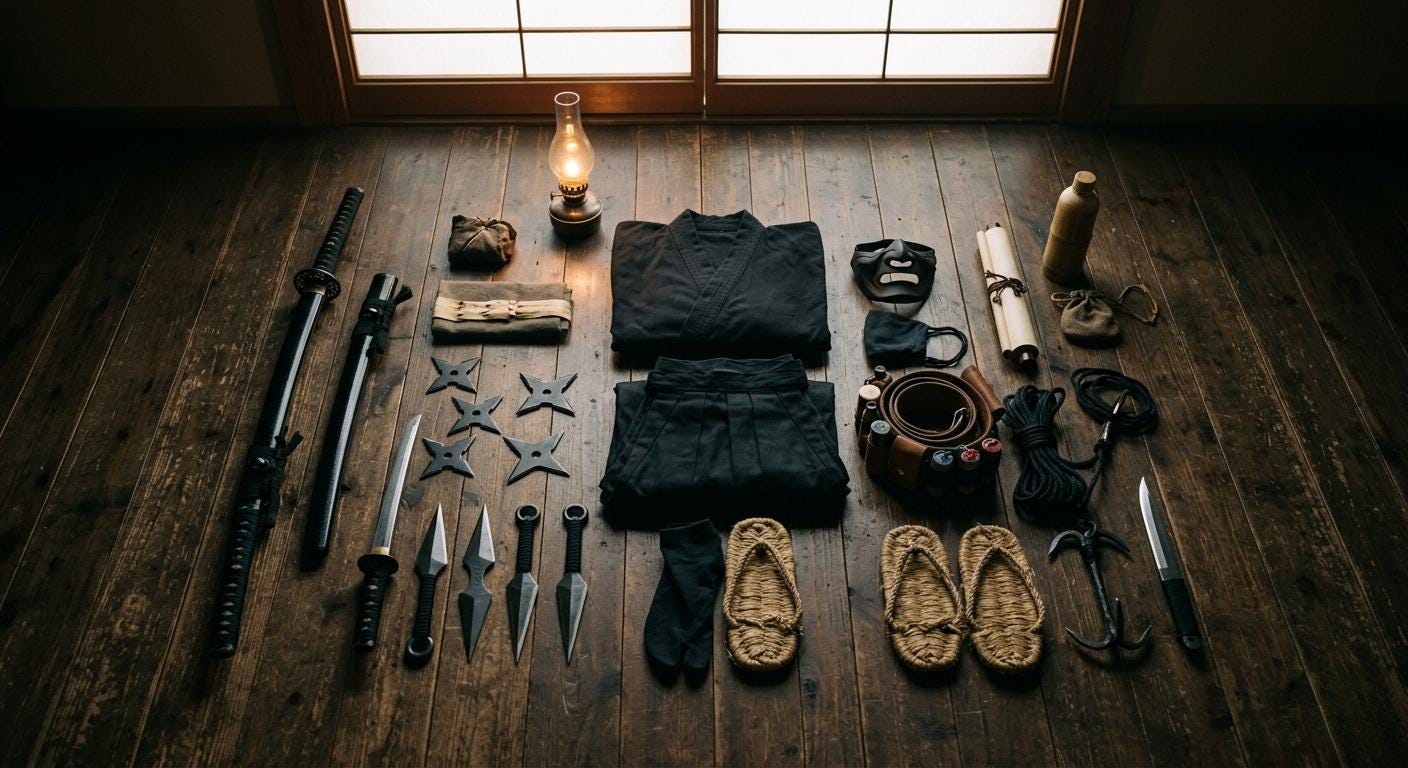 Historyczne opisy i podręczniki ninjutsu pokazują, że arsenał ninja był przede wszystkim funkcjonalny, a nie „egzotyczny”: