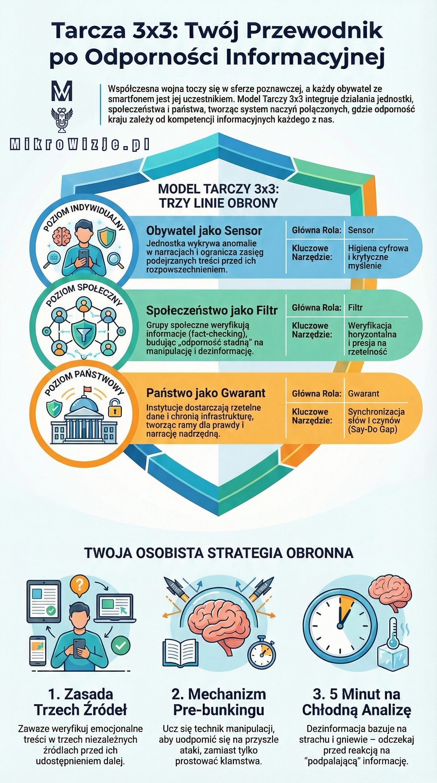 Komunikacja strategiczna w modelu Tarczy 3X3 to dynamiczny proces synchronizacji słów, obrazów i czynów na wszystkich poziomach funkcjonowania państwa. Jej skuteczność nie zależy od siły przekazu rządowego, lecz od spójności między instytucjami a świadomym, odpornym na manipulację społeczeństwem. W dobie zagrożeń hybrydowych, bezpieczna infosfera jest dobrem wspólnym, którego obrona zaczyna się od indywidualnego krytycyzmu, przechodzi przez etykę biznesu, a kończy na suwerennej narracji państwowej.