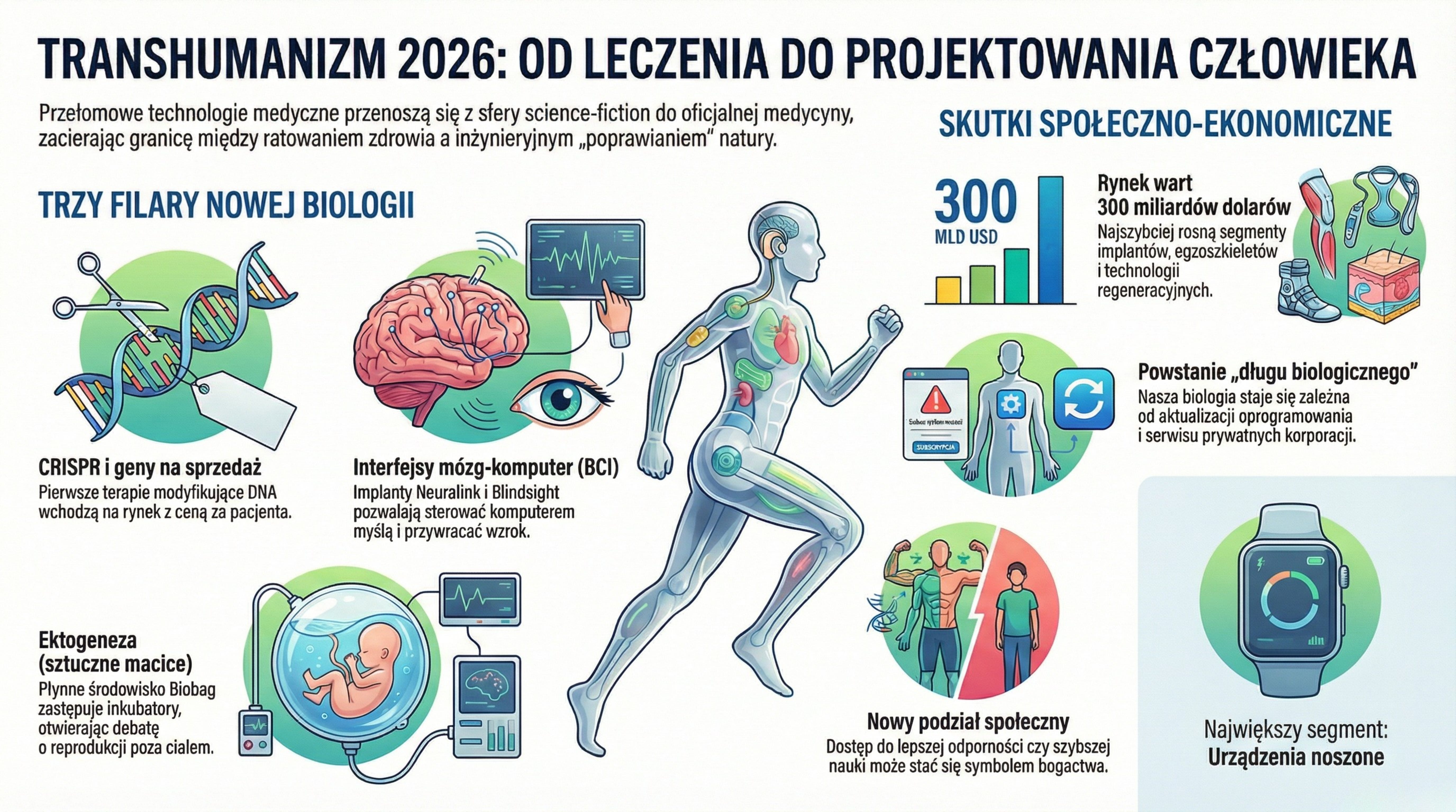 Często zapominamy o tym, że te technologie tworzą „biologiczny dług”. Osoba z implantem lub zmodyfikowanym genem będzie do końca życia potrzebować aktualizacji oprogramowania i serwisu sprzętu. To sprawia, że nasze zdrowie i biologia stają się całkowicie zależne od prywatnych korporacji.Konkluzja