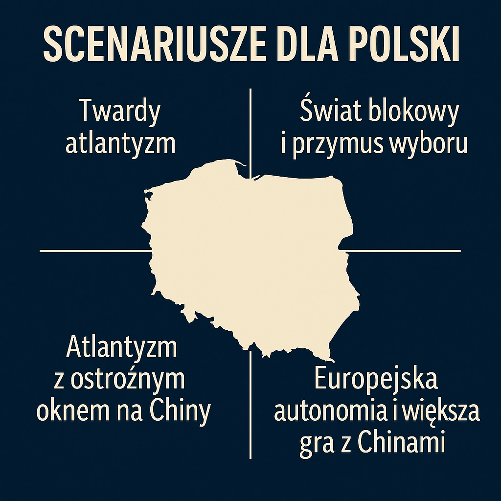 Rywalizacja USA–Chiny może wejść w fazę półzimnej wojny, z wyraźnym podziałem świata na dwa systemy technologiczne, finansowe i polityczne. Polska stanie się trwałym państwem frontowym Zachodu, z dużą obecnością wojskową i rosnącą rolą w regionalnym bezpieczeństwie. W długim horyzoncie kluczowe będzie, czy Polska zdoła wykorzystać swoje położenie do budowy własnej podmiotowości gospodarczej i technologicznej, czy pozostanie jedynie peryferyjnym buforem.