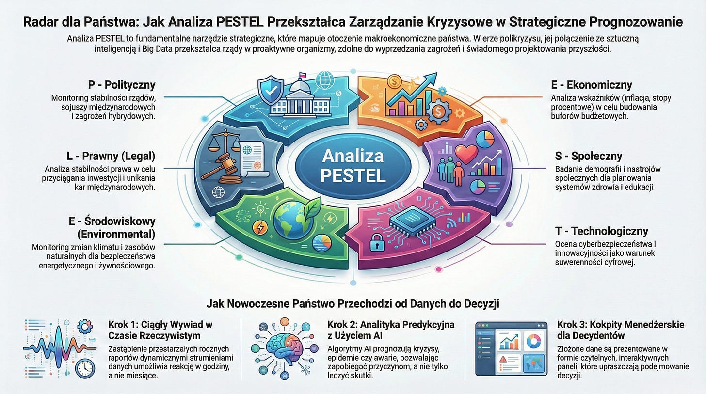Rządy na całym świecie, w tym administracja Unii Europejskiej, mierzą się z bezprecedensową zmiennością otoczenia, określaną mianem VUCA lub BANI (kruchy, niespokojny, nieliniowy świat). Tradycyjne, liniowe modele planowania zawiodły w obliczu pandemii, wojny na Ukrainie czy kryzysu energetycznego. Instytucje takie jak Komisja Europejska (w raportach Strategic Foresight) oraz rządy krajowe (np. Wielka Brytania, Singapur) wdrażają zaawansowaną analitykę danych, aby w czasie rzeczywistym diagnozować sześć obszarów modelu PESTEL i budować odporność państwa.