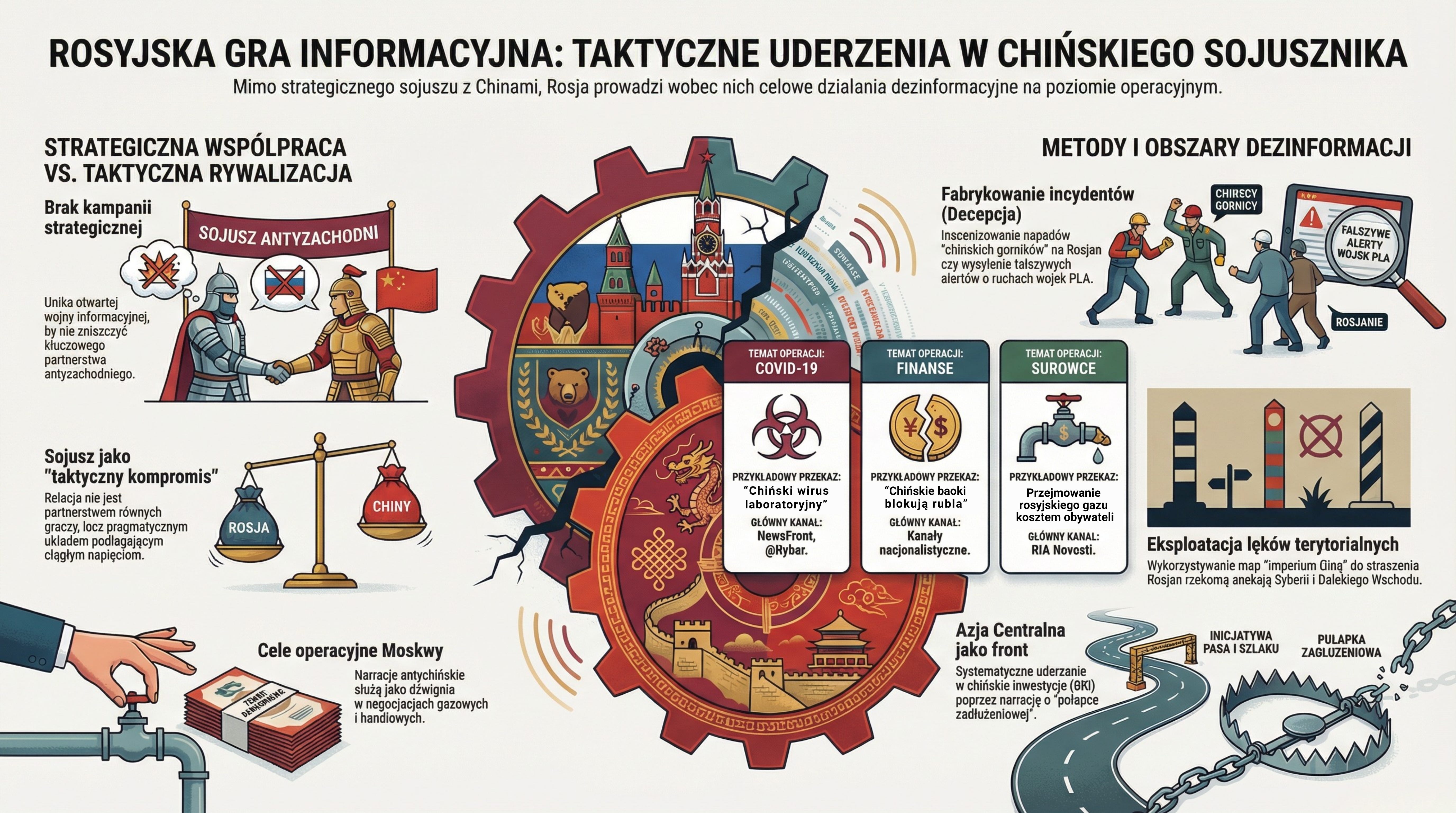 Główna teza płynąca z analiz operacyjnych jest jasna: Rosję i Chiny łączy wspólna agenda antyzachodnia na poziomie strategicznym, ale na szczeblach operacyjnym i taktycznym Moskwa nie waha się stosować narzędzi dezinformacji. Ten specyficzny układ to „taktycznie przydatny kompromis” – sojusz wymuszony okolicznościami, w którym brakuje miejsca na autentyczne, długofalowe zaufanie.