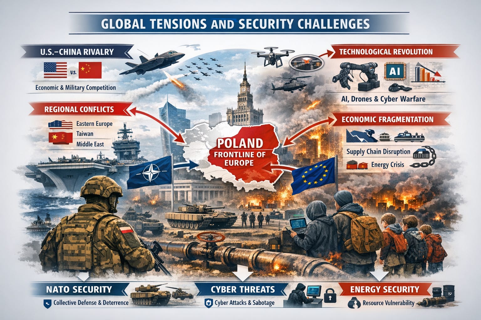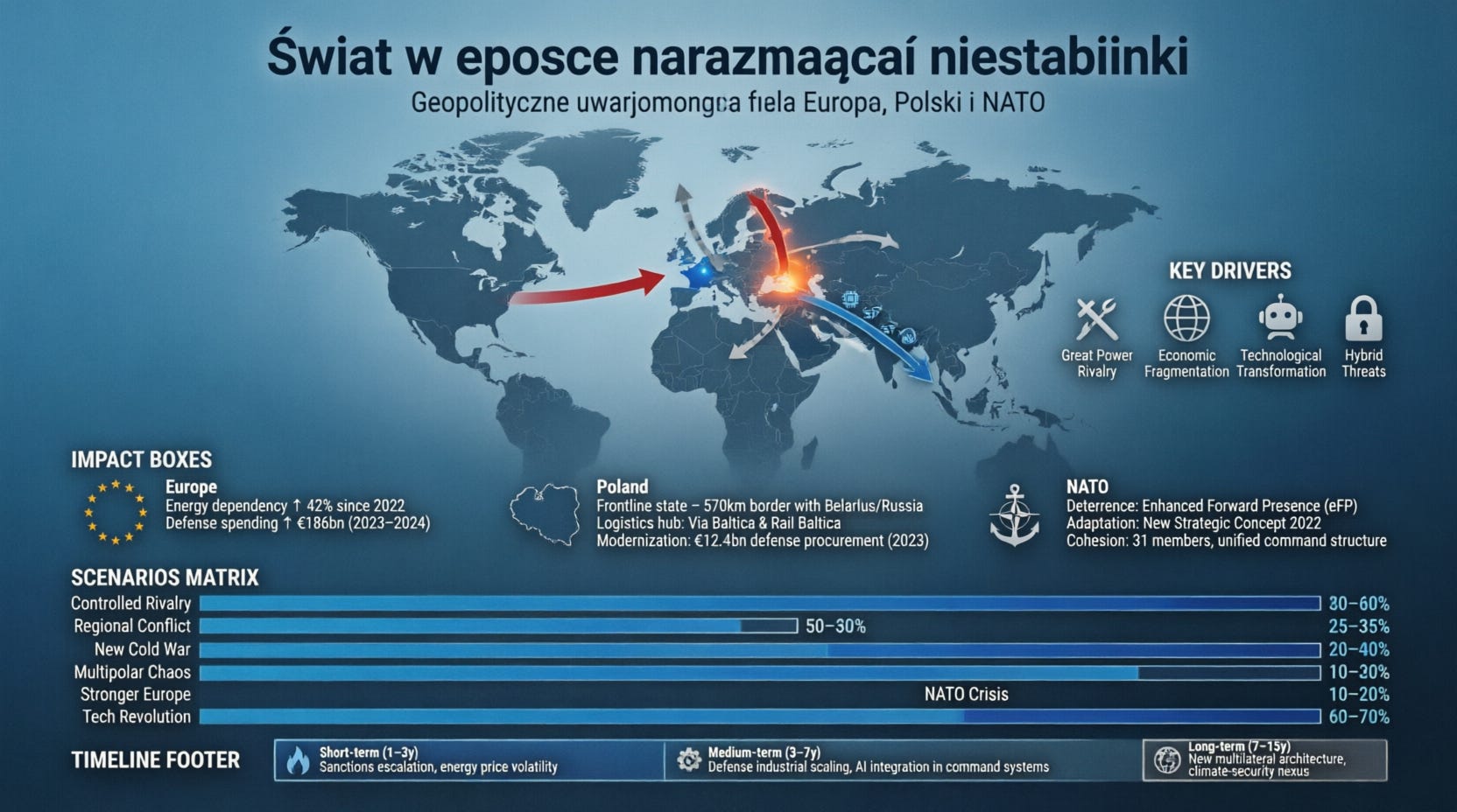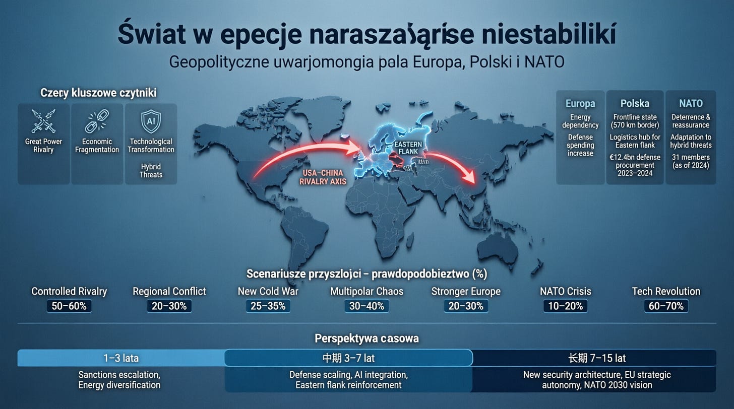 Świat wszedł w okres trwałej niestabilności, wynikającej z rywalizacji mocarstw, fragmentacji gospodarczej i gwałtownego rozwoju technologii o potencjale militarnym. Układ sił przesuwa się w stronę wielobiegunowości, w której ani USA, ani Chiny nie są w stanie narzucić jednolitego porządku. Europa musi funkcjonować w warunkach rosnącej presji geopolitycznej, jednocześnie wzmacniając własne zdolności obronne i odporność infrastrukturalną. Polska, jako państwo frontowe i kluczowy element wschodniej flanki NATO, zyskuje na znaczeniu, ale również staje się bardziej narażona na działania hybrydowe i destabilizujące. NATO pozostaje centralnym filarem bezpieczeństwa, jednak jego skuteczność zależy od zdolności adaptacji do nowych zagrożeń i utrzymania spójności politycznej sojuszników.