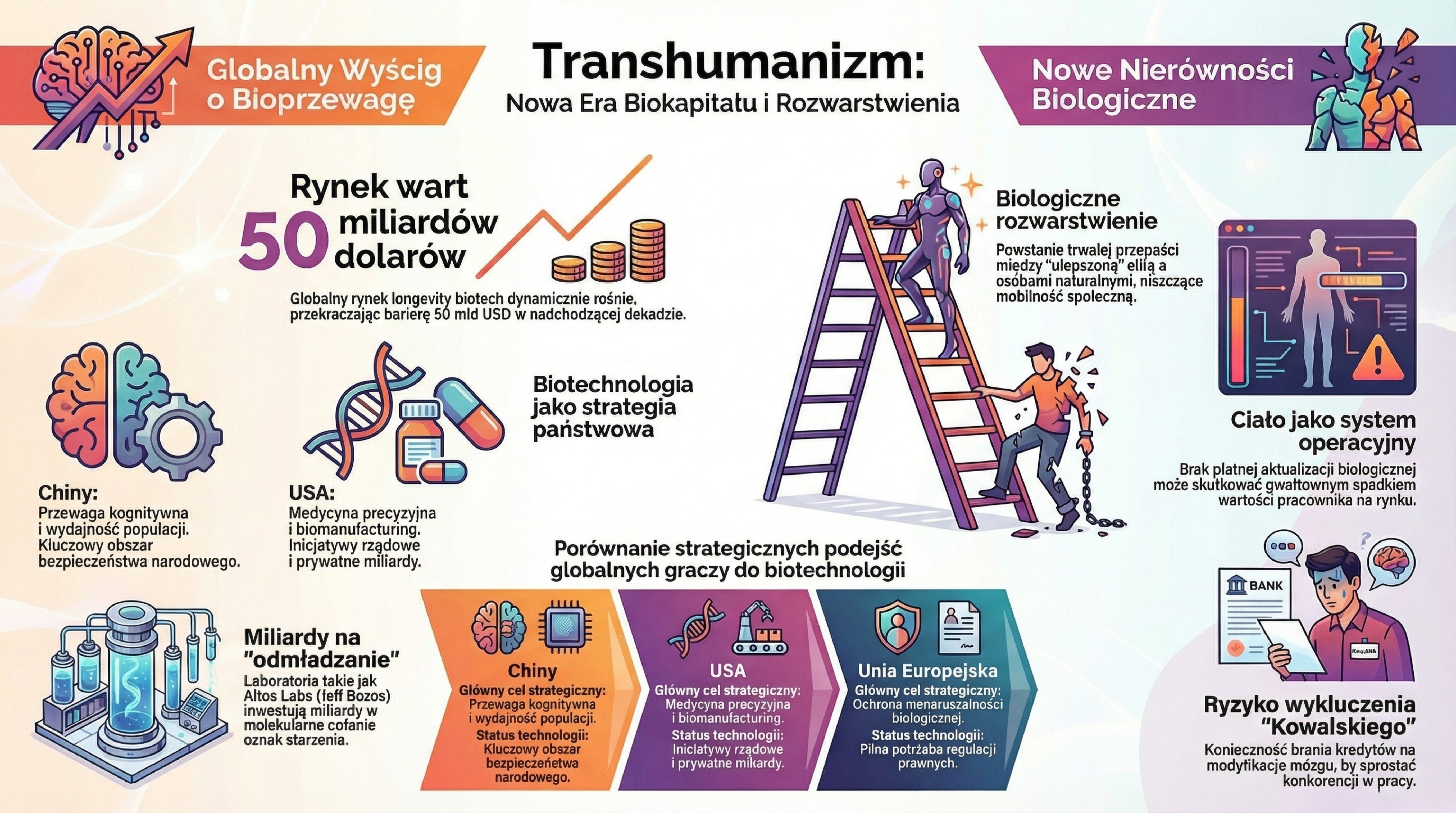 Zarówno Chiny, jak i USA uznają za strategiczne rozwijanie biotechnologii, medycyny precyzyjnej i narzędzi potencjalnie prowadzących do biologicznego „ulepszania” ludzi. W oficjalnych planach rozwojowych (np. „Healthy China 2030”, amerykańskie inicjatywy w biotechnologii i biomanufacturingu) zapisują cele zwiększania produktywności, zdrowia i długowieczności populacji do okolic roku 2030, choć nie używają wprost języka „human enhancement”.