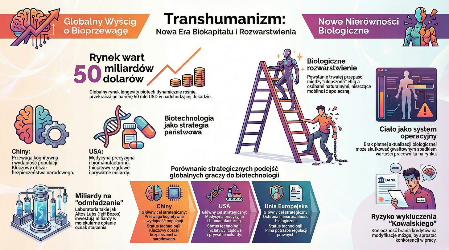 Transhumanizm przestał być ciekawostką dla filozofów, a stał się twardą koniecznością ekonomiczną. Nasze ciało jest dziś traktowane jak system operacyjny: jeśli nie wykupisz płatnej aktualizacji, Twoja wartość na rynku spadnie.