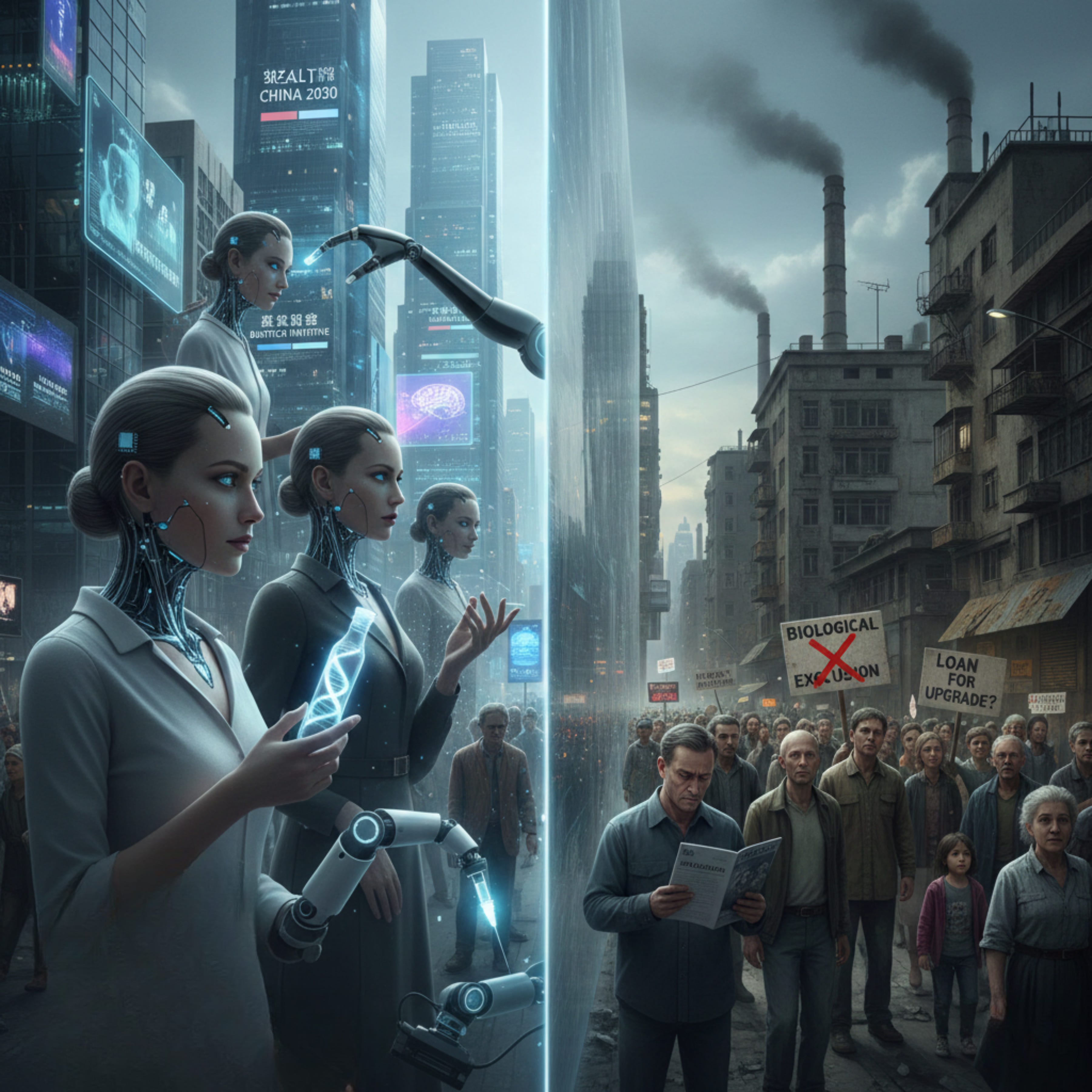 Eksperci ostrzegają przed powstaniem „biologicznego rozwarstwienia”: scenariusza, w którym dostęp do kosztownych technologii ulepszania organizmu (np. terapii genowych czy BCI) będzie zarezerwowany wyłącznie dla najbogatszych.