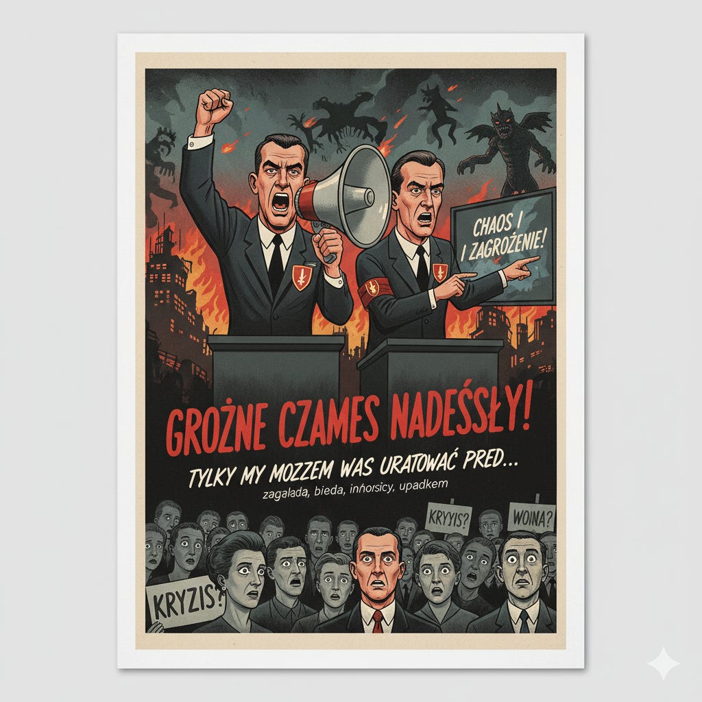 Mobilizacja własnego elektoratu Strach przed alternatywą lub “wrogiem” jest silniejszym motorem do działania niż pozytywna wizja. Kreowanie poczucia zagrożenia polaryzuje i cementuje poparcie zwolenników wokół przywódcy lub partii, która obiecuje ochronę.